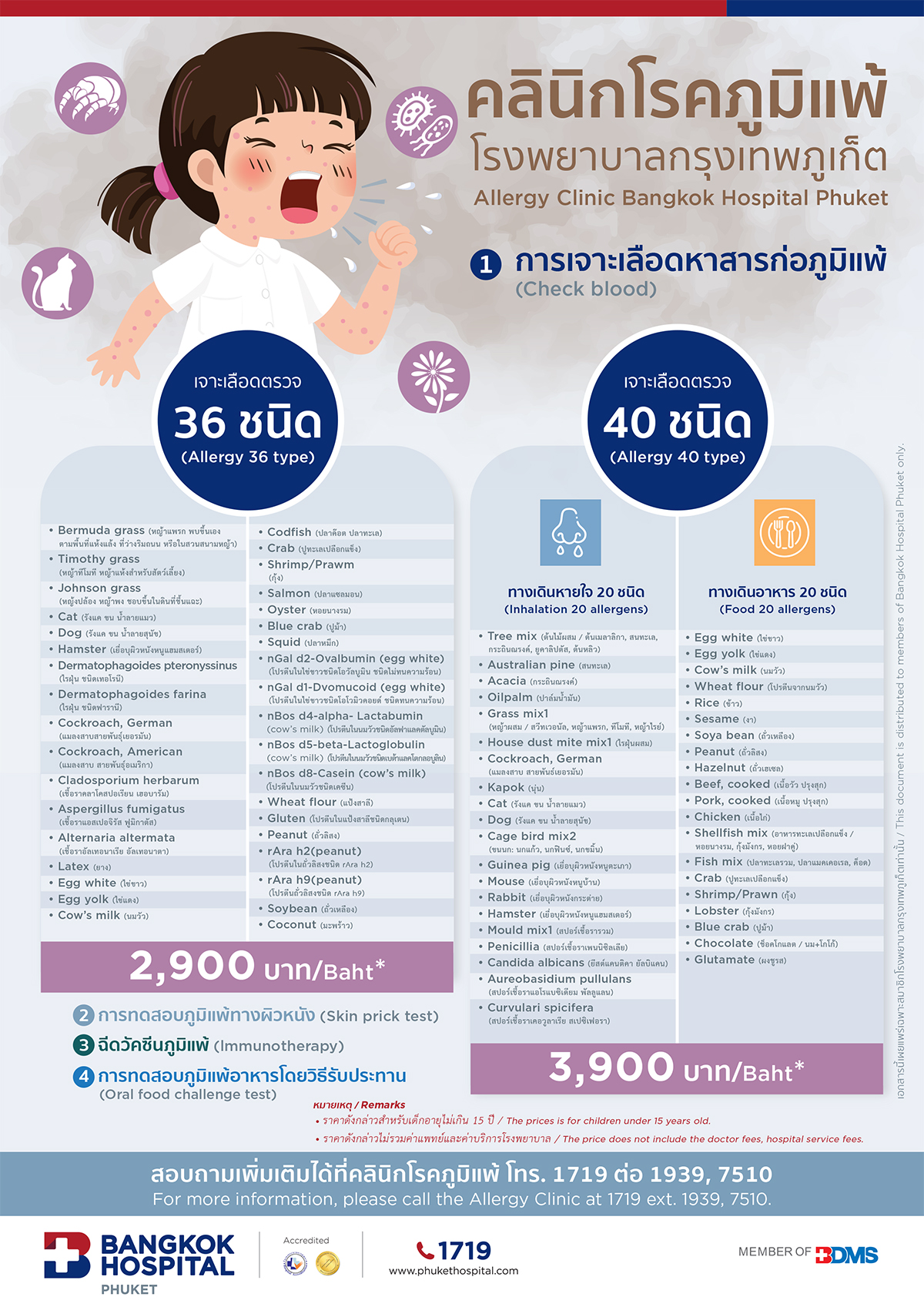Blood Test Allergy Package for Kids Start from 2,900 LINE iconLINE More Information For more information, please contact: Child Clinic, Ground floor Open daily from 8.00 am. – 5.00 pm. Facebook icon m.me/BangkokHospitalPhuket LINE icon https://lin.ee/sEb3wvo info@phukethospital.com 076 254 425 Ext. 1011