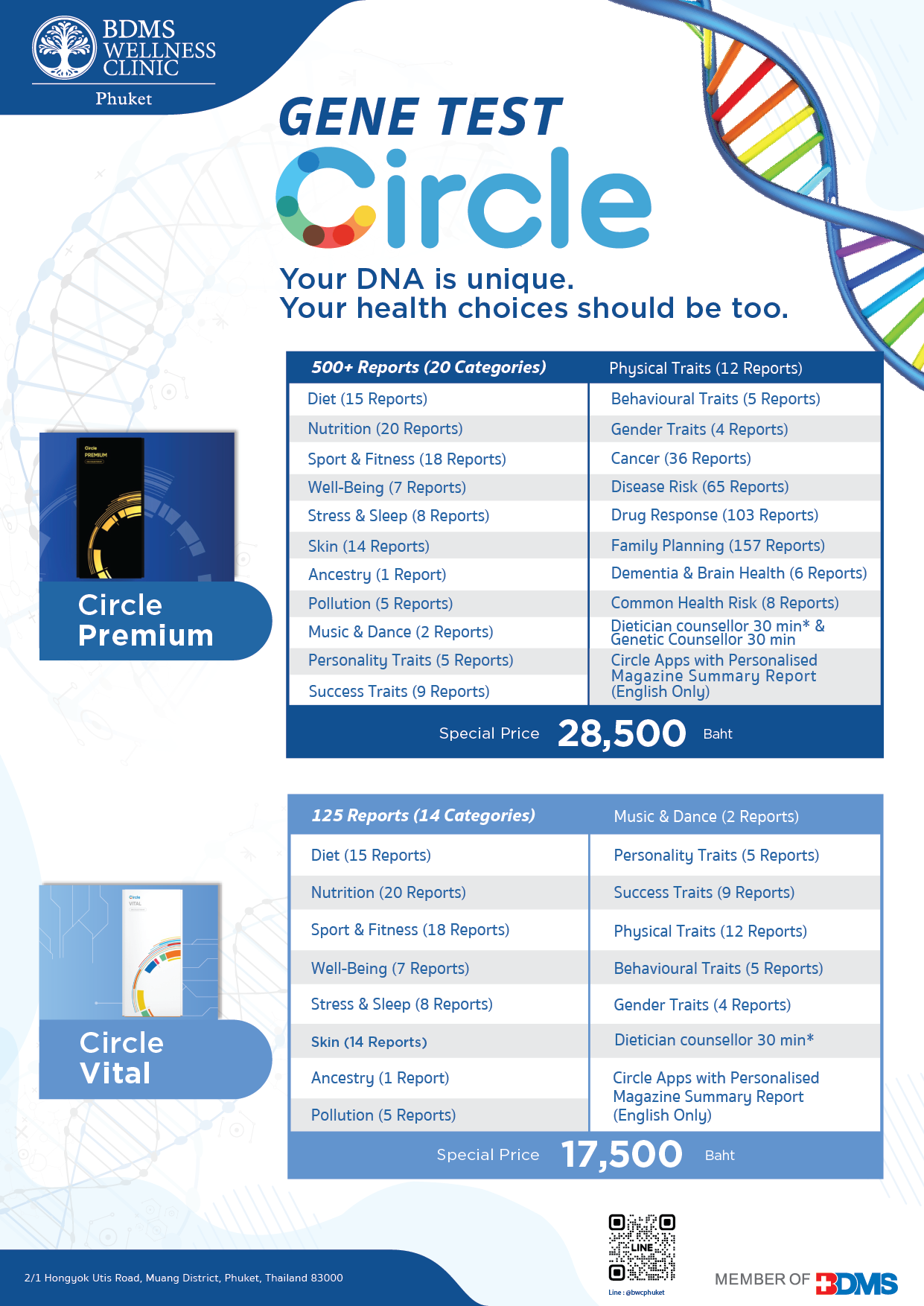 Gene Test Circle Start from 17,500 LINE iconLINE More Information For more information, please contact: BDMS Wellness Clinic Phuket, 4th floor Open daily from 8.00 am. – 4.00 pm. Facebook icon m.me/BangkokHospitalPhuket LINE icon https://lin.ee/az6WXbA info@phukethospital.com 076 254 425 Ext. 2027