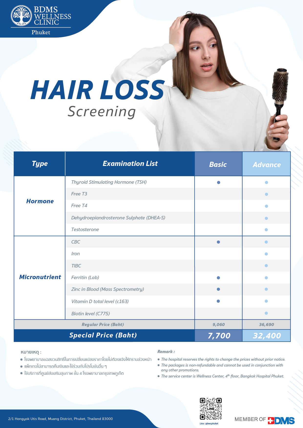 Hair Loss Screening Start from 7,700 LINE iconLINE More Information For more information, please contact: BDMS Wellness Clinic Phuket, 4th floor Open daily from 8.00 am. – 4.00 pm. Facebook icon m.me/BangkokHospitalPhuket LINE icon https://lin.ee/az6WXbA info@phukethospital.com 076 254 425 Ext. 2027