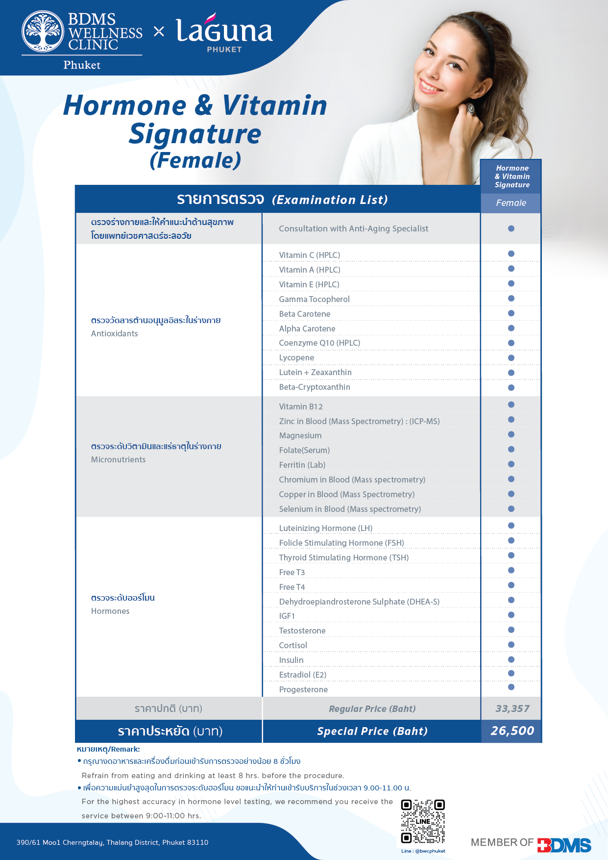 Hormone & Vitamin Signature (Female) Start from 26,500 LINE iconLINE More Information For more information, please contact: BDMS Wellness Clinic Phuket, 4th floor Open daily from 8.00 am. – 4.00 pm. Facebook icon m.me/BangkokHospitalPhuket LINE icon https://lin.ee/az6WXbA info@phukethospital.com 076 254 425 Ext. 2027