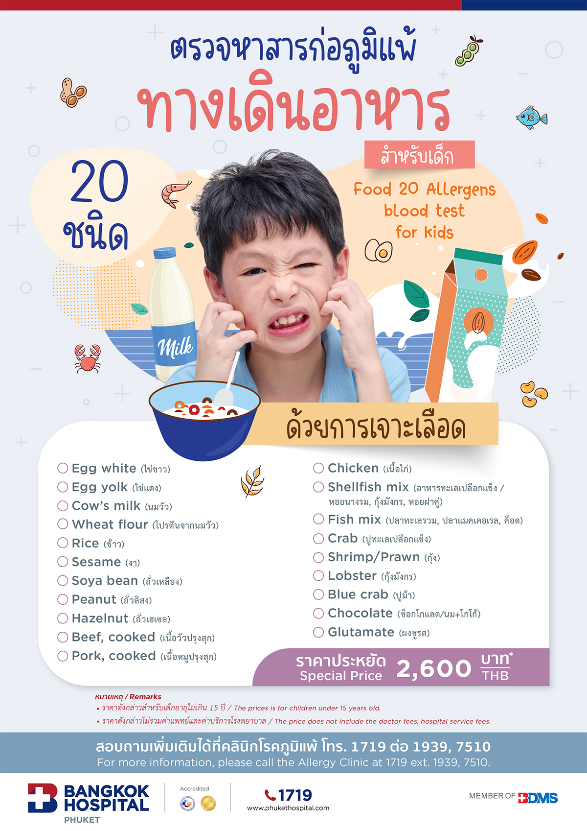 Food 20 Allergens blood test for kids 2,600 LINE iconLINE More Information For more information, please contact: Child Clinic, Ground floor Open daily from 8.00 am. – 5.00 pm. Facebook icon m.me/BangkokHospitalPhuket LINE icon https://lin.ee/sEb3wvo info@phukethospital.com 076 254 425 Ext. 1011