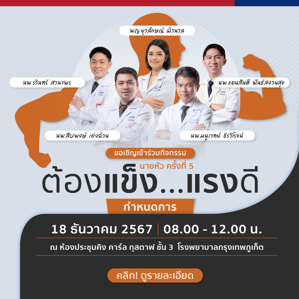 ขอเชิญเข้าร่วมกิจกรรมนายหัว ครั้งที่ 5 “ต้องแข็ง…แรงดี” 12 ธันวาคม 256712 ธันวาคม 2024Pattama Kokittipongข่าวสารจากโรงพยาบาลกรุงเทพภูเก็ต, ข่าวกิจกรรม