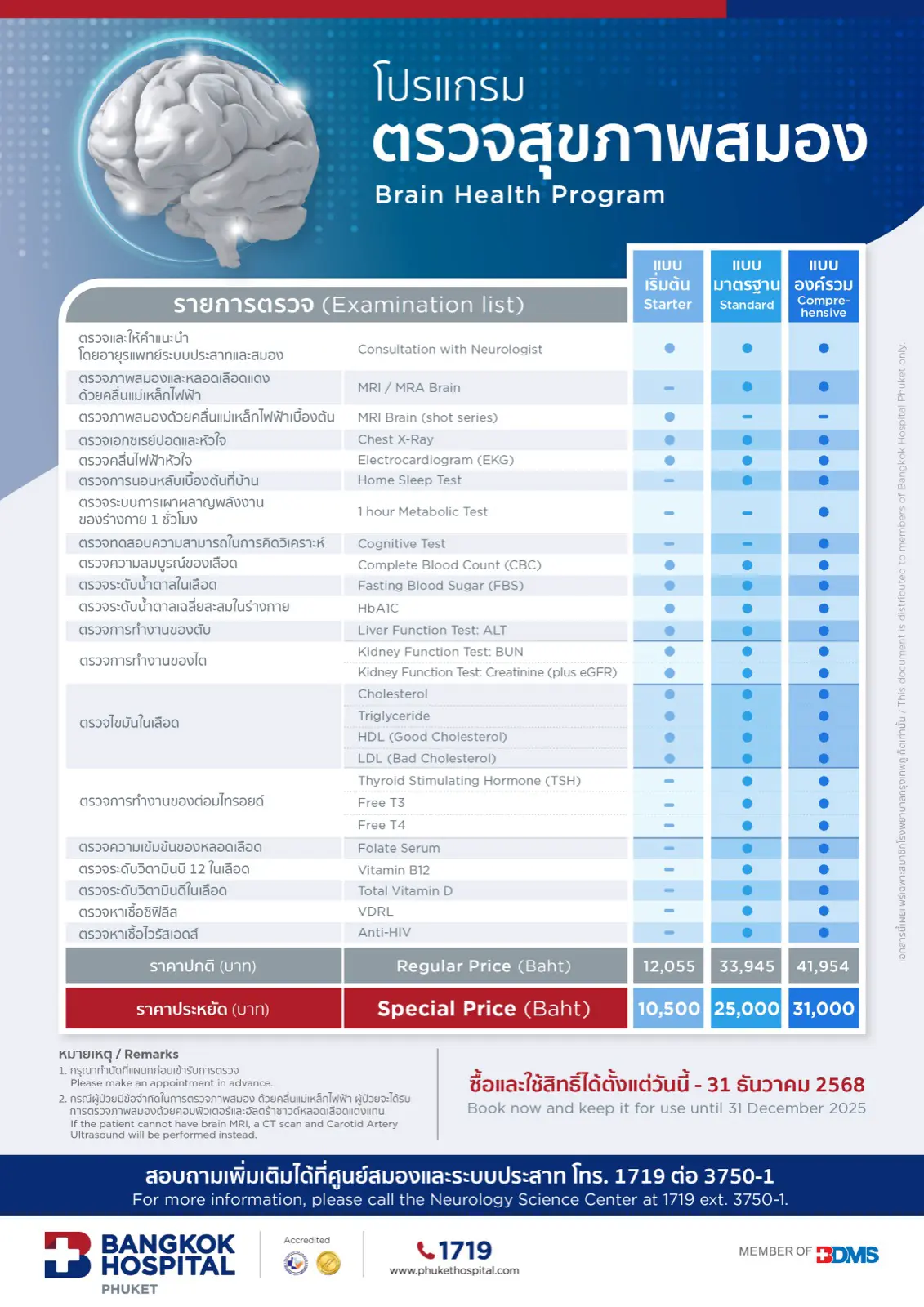 โปรแกรมตรวจสุขภาพสมอง สิ้นสุด 31/12/2025 เริ่มต้น 10,500 LINE iconLINE ติดต่อสอบถาม สอบถามเพิ่มเติม ศูนย์สมองและระบบประสาท (ชั้น 2) เปิดบริการทุกวัน ตั้งแต่ 08.00 – 17.00 น. Facebook icon https://m.me/BangkokHospitalPhuket LINE icon https://lin.ee/2Rl1AGs info@phukethospital.com 076 254 425 ต่อ 3750-1