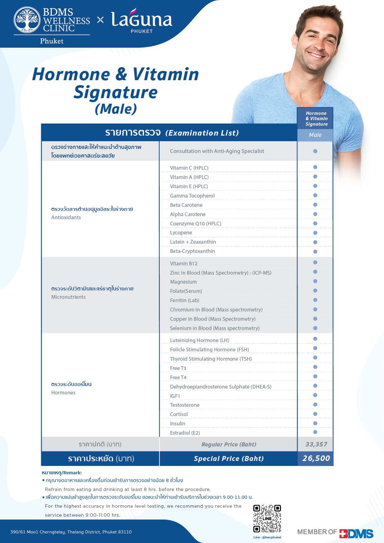 Hormone & Vitamin Signature (Male) เริ่มต้น 26,500 LINE iconLINE ติดต่อสอบถาม สอบถามเพิ่มเติม บีดีเอ็มเอส เวลเนส คลินิก ภูเก็ต (ชั้น 4) เปิดบริการทุกวัน ตั้งแต่ 08.00 – 16.00 น. Facebook icon m.me/BangkokHospitalPhuket LINE icon https://lin.ee/az6WXbA info@phukethospital.com 076 254 425 ต่อ 2027