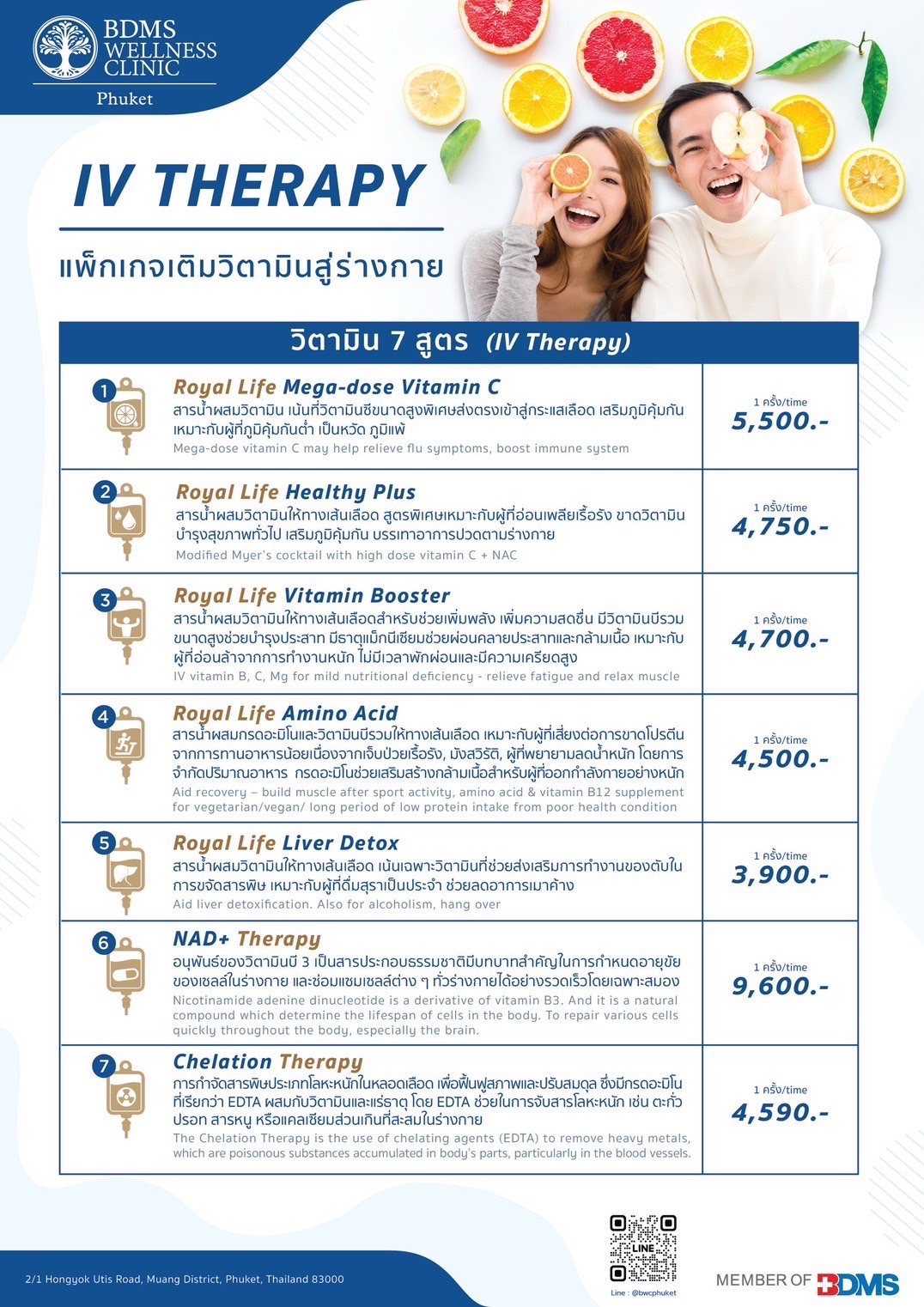 แพ็กเกจเติมวิตามินสู่ร่างกาย สิ้นสุด 31/12/2025 เริ่มต้น 2,500 LINE iconLINE ติดต่อสอบถาม สอบถามเพิ่มเติม บีดีเอ็มเอส เวลเนส คลินิก ภูเก็ต (ชั้น 4) เปิดบริการทุกวัน ตั้งแต่ 08.00 – 16.00 น. Facebook icon m.me/BangkokHospitalPhuket LINE icon https://lin.ee/az6WXbA info@phukethospital.com 076 254 425 ต่อ 2027
