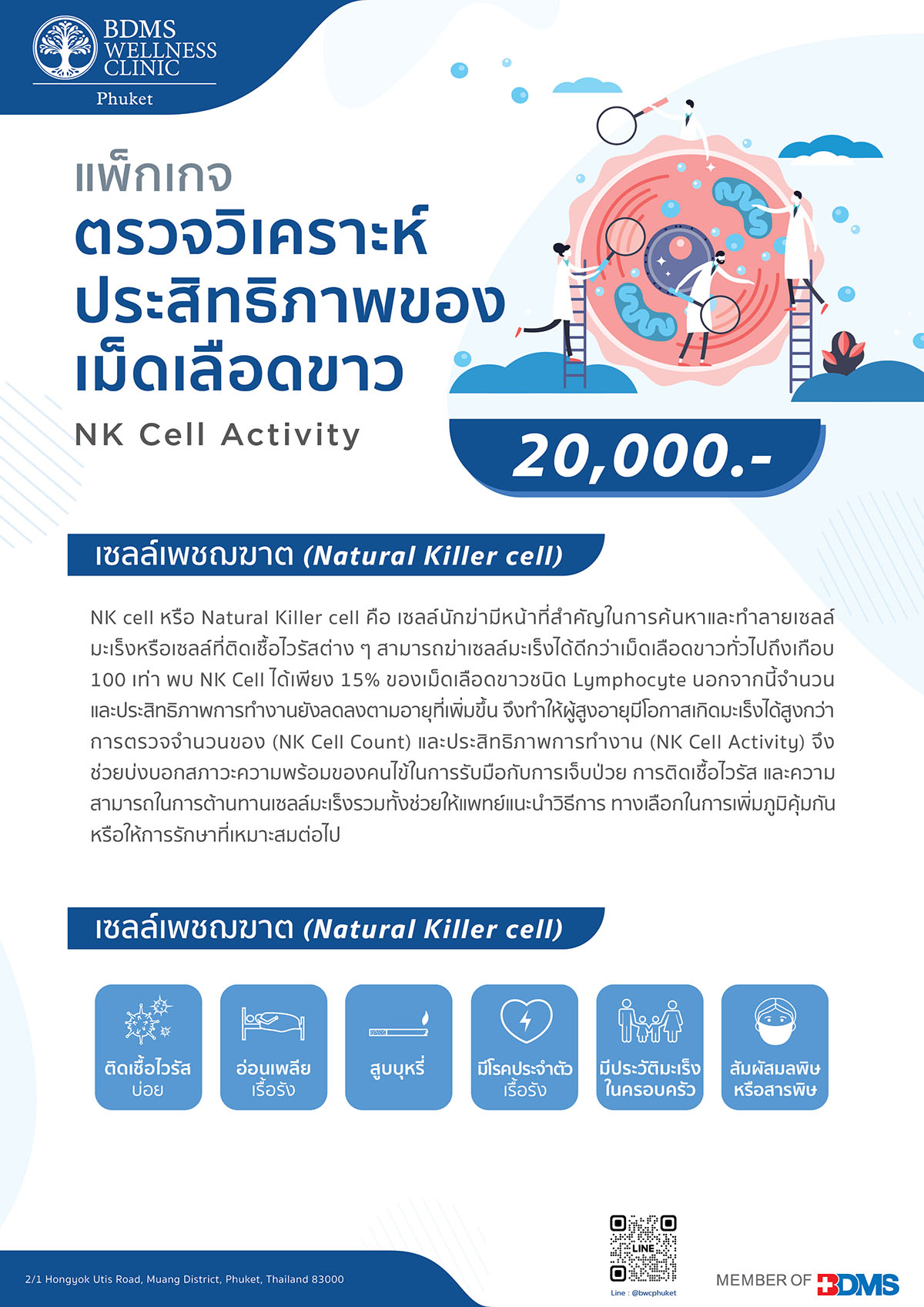แพ็กเกจตรวจวิเคราะห์ประสิทธิภาพของเม็ดเลือดขาว (NK Cell Activity) 20,000 LINE iconLINE ติดต่อสอบถาม สอบถามเพิ่มเติม บีดีเอ็มเอส เวลเนส คลินิก ภูเก็ต (ชั้น 4) เปิดบริการทุกวัน ตั้งแต่ 08.00 – 16.00 น. Facebook icon m.me/BangkokHospitalPhuket LINE icon https://lin.ee/az6WXbA info@phukethospital.com 076 254 425 ต่อ 2027