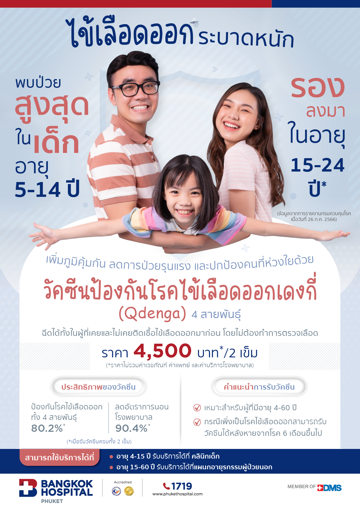 วัคซีนป้องกันโรคไข้เลือดออกเดงกี่ (Qdenga) 4 สายพันธุ์ 4,500 LINE iconLINE ติดต่อสอบถาม สอบถามเพิ่มเติม สามารถรับบริการได้ที่ อายุ 4-15 ปี รับบริการได้ที่ คลินิกเด็ก อายุ 15-60 ปี รับบริการได้ที่แผนกอายุรกรรมผู้ป่วยนอก แผนกผู้ป่วยนอก (ชั้น 1) เปิดบริการทุกวัน ตั้งแต่ 08.00 – 17.00 น. คลินิกเด็ก (กุมารเวช) (ชั้น 1) เปิดบริการทุกวัน ตั้งแต่ 08.00 – 17.00 น. Facebook icon m.me/BangkokHospitalPhuket LINE icon https://lin.ee/sEb3wvo info@phukethospital.com 076 254 425 ต่อ 1011, 3709