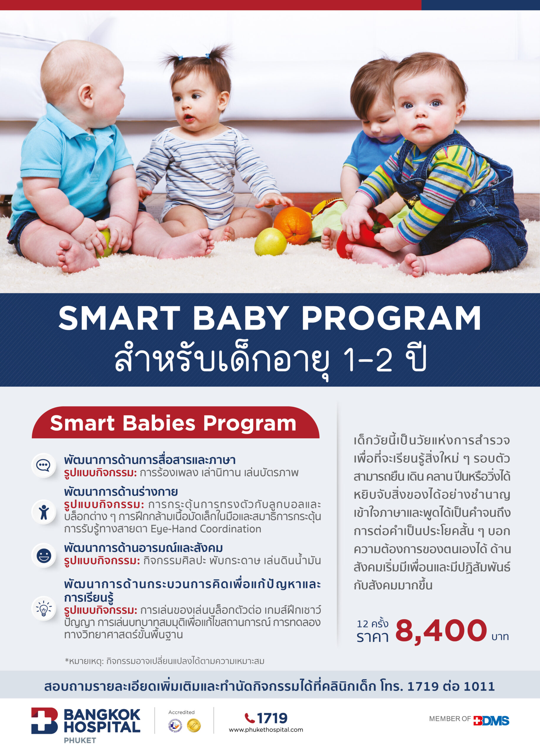 Smart Baby Program (สำหรับเด็กอายุ 1-2 ปี) 8,400 LINE iconLINE ติดต่อสอบถาม สอบถามเพิ่มเติม คลินิกเด็ก (กุมารเวช) (ชั้น 1) เปิดบริการทุกวัน ตั้งแต่ 08.00 – 17.00 น. Facebook icon m.me/BangkokHospitalPhuket LINE icon https://lin.ee/sEb3wvo info@phukethospital.com 076 254 425 ต่อ 1011