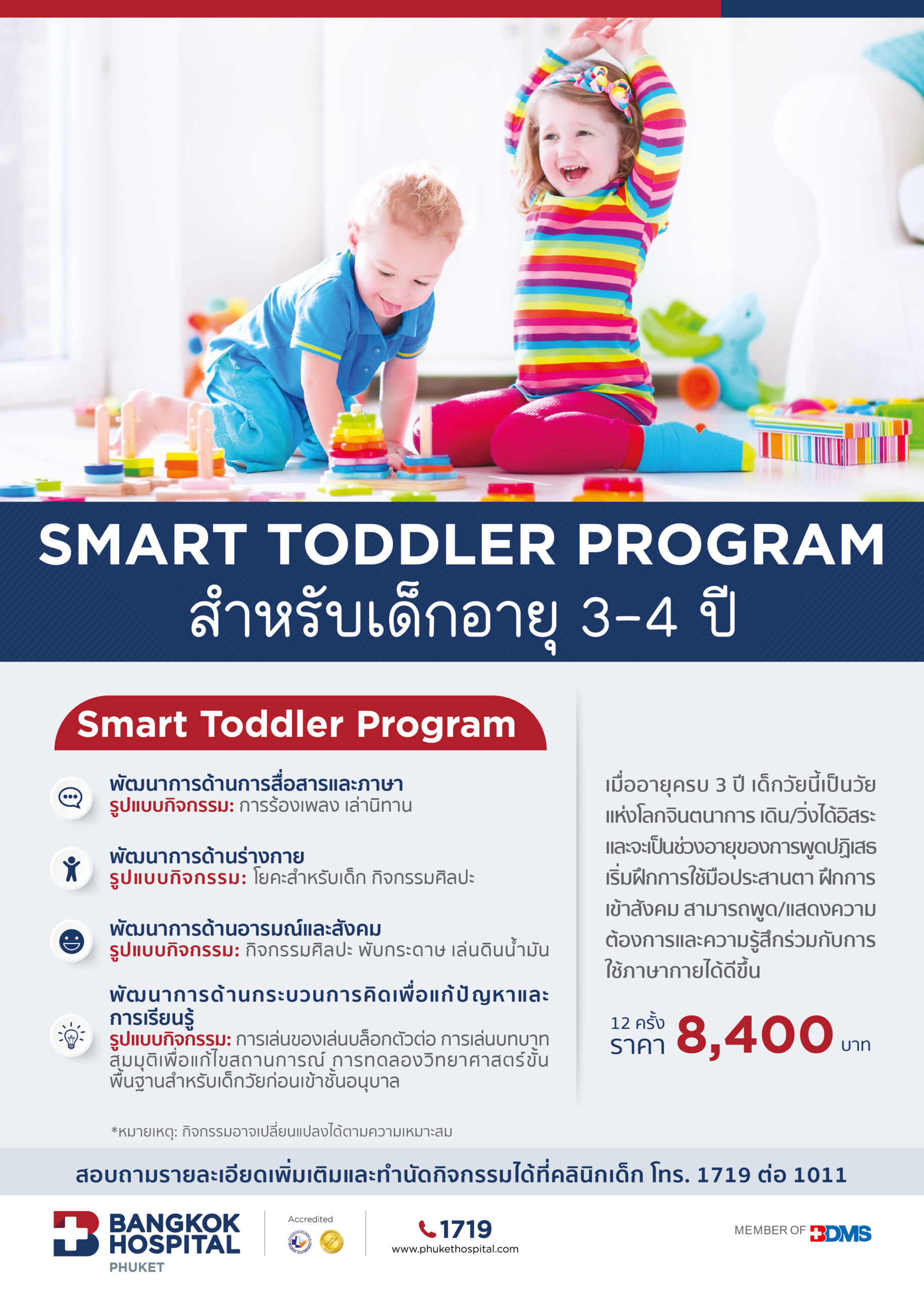 Smart Toddler Program (สำหรับเด็กอายุ 3-4 ปี) 8,400 LINE iconLINE ติดต่อสอบถาม สอบถามเพิ่มเติม คลินิกเด็ก (กุมารเวช) (ชั้น 1) เปิดบริการทุกวัน ตั้งแต่ 08.00 – 17.00 น. Facebook icon m.me/BangkokHospitalPhuket LINE icon https://lin.ee/sEb3wvo info@phukethospital.com 076 254 425 ต่อ 1011