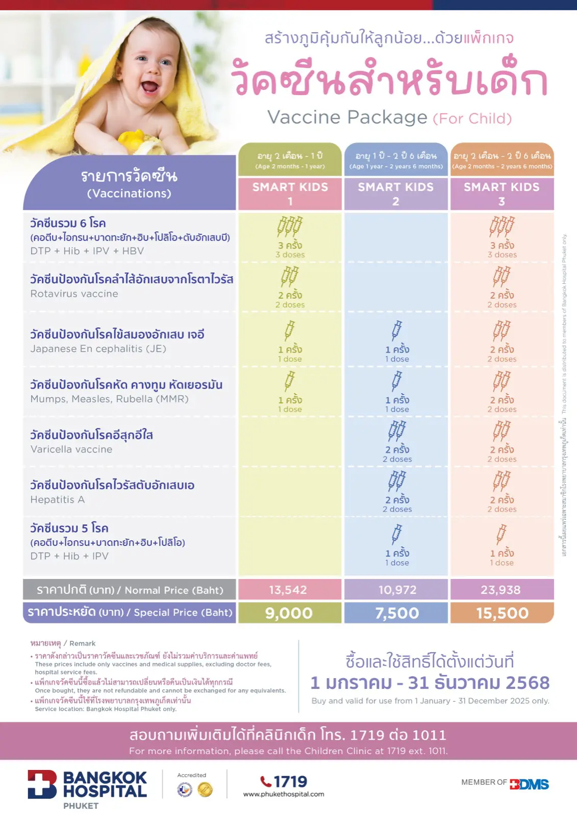 วัคซีนสำหรับเด็ก สิ้นสุด 31/12/2025 9,000 LINE iconLINE ติดต่อสอบถาม สอบถามเพิ่มเติม คลินิกเด็ก (กุมารเวช) (ชั้น 1) เปิดบริการทุกวัน ตั้งแต่ 08.00 – 17.00 น. Facebook icon m.me/BangkokHospitalPhuket LINE icon https://lin.ee/sEb3wvo info@phukethospital.com 076 254 425 ต่อ 1011